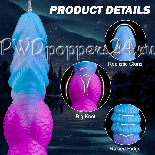 Внешне игрушка выглядит как яркий гибрид морского змея и инопланетного члена: плавный градиент от холодного голубого к сочному фиолетово-розовому, покрытие с чешуйчатой фактурой и рельефными выступами. Отчетливо видно три характерных элемента — реалистичная головка с выраженной венозной структурой ("Realistic Glans"), крупный узел в основании ("Big Knot") и несколько накатанных ступенчатых колец по стволу ("Raised Ridge"), которые обещают крепкую хватку и приятные ощущения при движении.