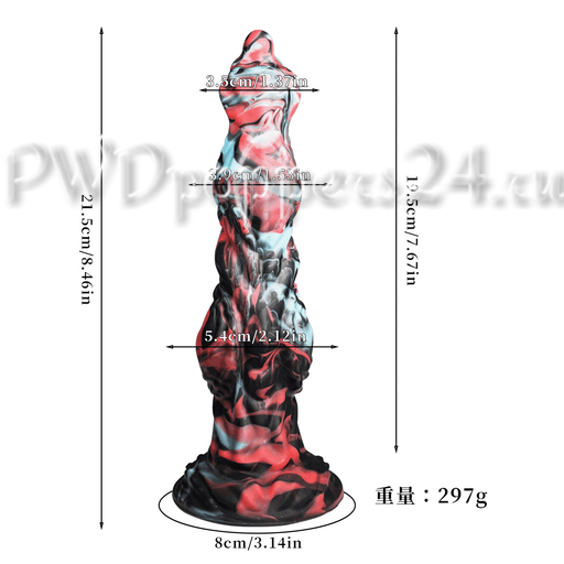 Материал: жидкий силикон медицинского класса — бархатистый на ощупь, достаточно упругий, чтобы держать форму, и при этом мягкий к телу. Непористая структура облегчает гигиену и делает изделие более долговечным. Общая длина изделия — 21,5 см, вставная (рабочая) длина — около 19,5 см, диаметр наиболее объёмной части — примерно 3,5 см; вес — 297 г. Такие параметры делают его заметным, но не громоздким — идеально для тех, кто любит солидные, запоминающиеся реквизиты.