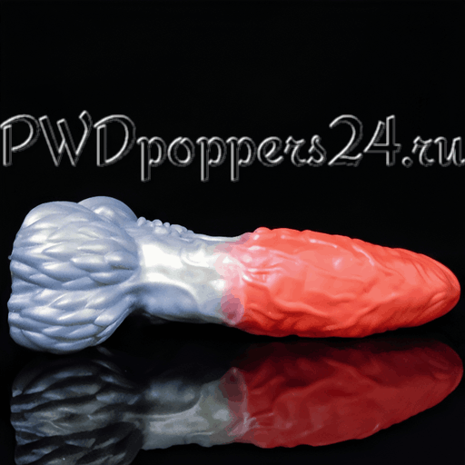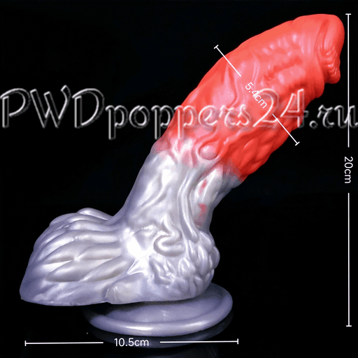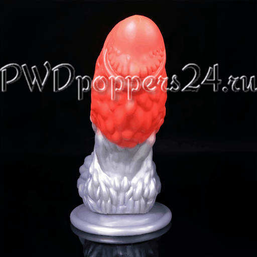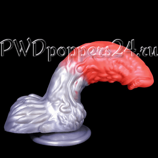 Игрушка имеет двухцветную окраску: насыщенно‑красная верхняя часть переходит в металлически‑серебристую основу. Шея и стержень покрыты выраженной рельефной текстурой с волнообразными выступами, узелками и прожилками — структура призвана усиливать тактильные ощущения при использовании. Центральная часть слегка изогнута, что делает траекторию движения более анатомичной, а широкая присоска у основания гарантирует надежную фиксацию на ровной поверхности и позволяет использовать фаллоимитатор «свободно-руками».