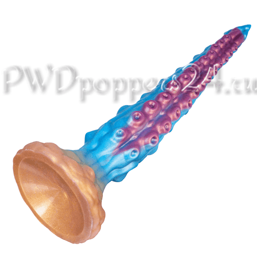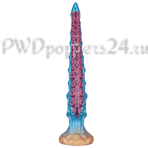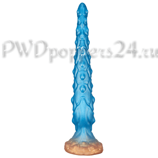 Заострённый носик для лёгкого входа, плотные стимулирующие выступы вдоль ствола, многочисленные «сосочки» разной высоты и крупное основание‑присоска. Цветовая палитра — холодный морской голубой с градиентами сиреневого и бронзового на фланце — выглядит как будто вещь только что прилетела с далёкой планеты и готова исследовать новые ландшафты.