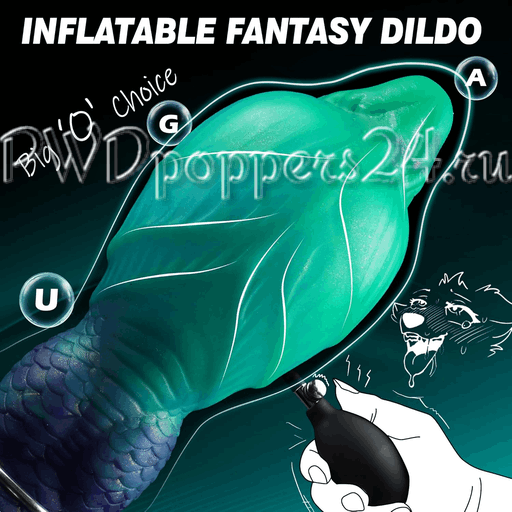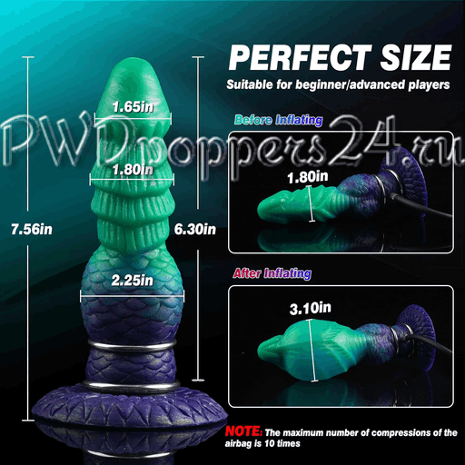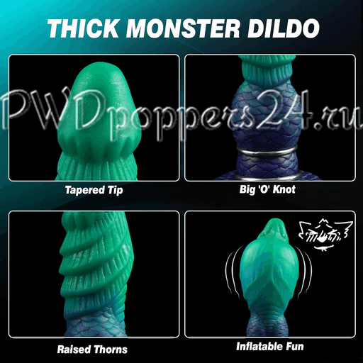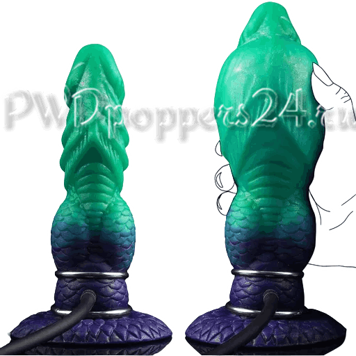 Дизайн и тактильные элементы: наконечник выполнен заострённым для облегчённого введения, далее идёт выраженный «узел» или уплотнение, создающее заметную смену профиля. По корпусу проходят рельефные наплывы и «шипообразные» выступы — они добавляют текстурности при движениях, а поверхность, имитирующая чешую, подчёркивает «инопланетную» эстетику. Цветовой градиент от зелёного к синему и аккуратная форма основания делают изделие декоративно-презентабельным.