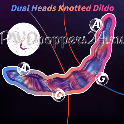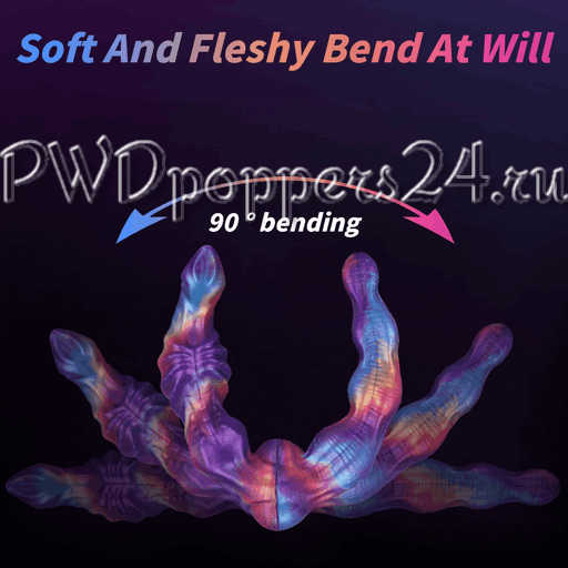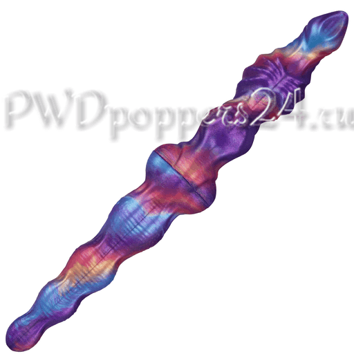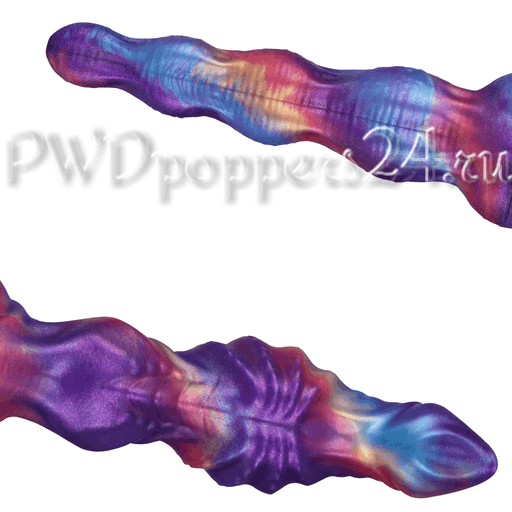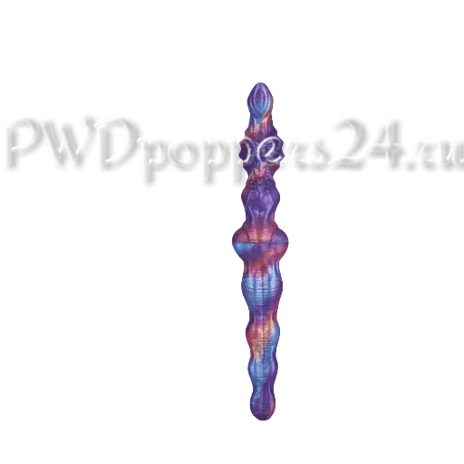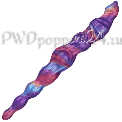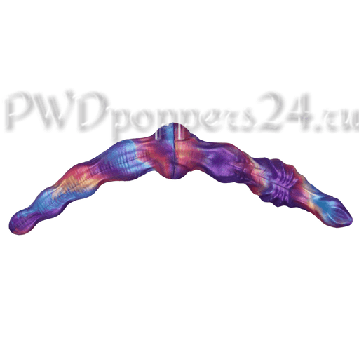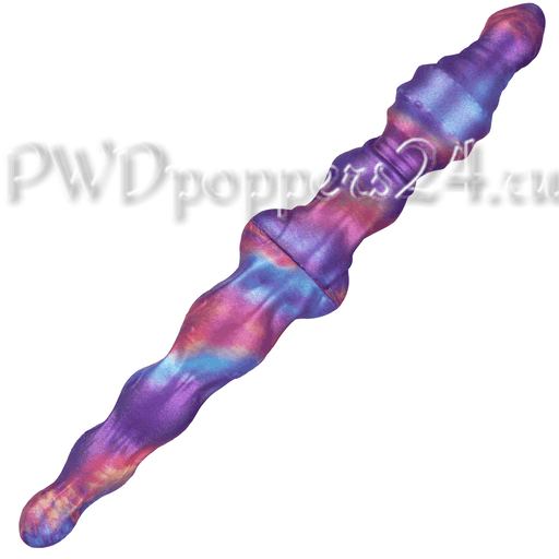 Визуально изделие напоминает космическое образование: переливы фиолетовых, синих и розово‑оранжевых тонов формируют мраморный узор, который меняет глубину и оттенок в зависимости от угла освещения. Поверхность не гладкая — по всей длине расположены волнообразные выступы, узловатые сужения и расширения; эти рельефы очевидно рассчитаны на усиление контакта и тактильного отклика. Концы изделия оформлены в виде округлых, слегка заострённых модулей, созданных для плавного контура, а центр соединён прочным, «неразрывным» шарниром — конструкция, выдерживающая изгибы и обеспечивающая надёжность соединения двух головок.