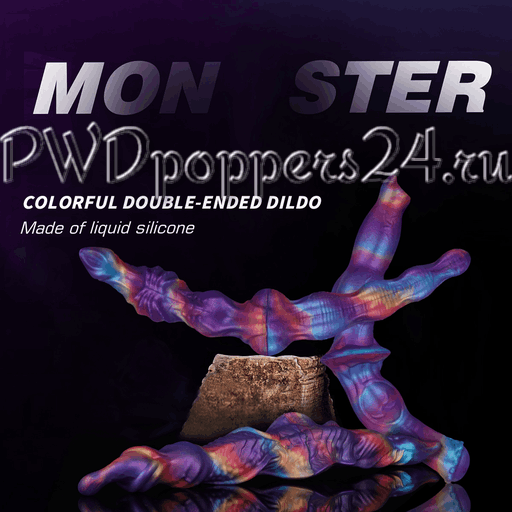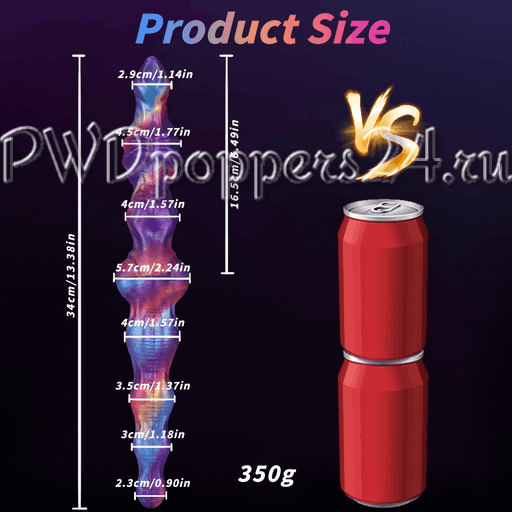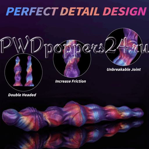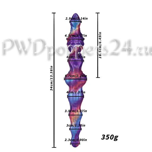 Краткие технические характеристики: материал — медицинский силикон; общая длина ~35,5 см; доступные рабочие длины модулей — ~17 см и ~18,5 см; диаметр максимальной части — ~6,4 см; вес — ~342 г. Цветовая гамма — перламутрово‑космическое смешение фиолетового, синего и розово‑оранжевого; ключевые элементы дизайна — двусторонняя конфигурация, выраженный рельеф для увеличения трения и прочный шарнир‑соединение.