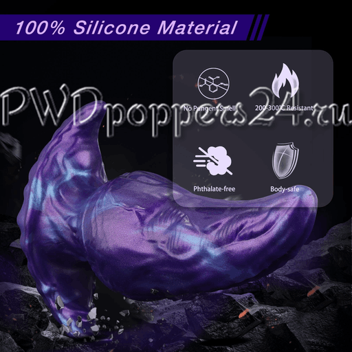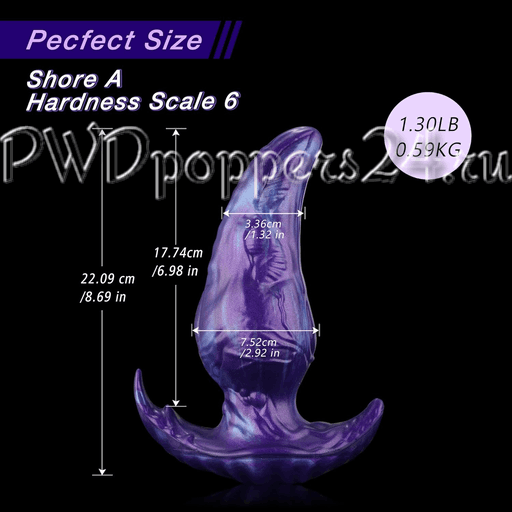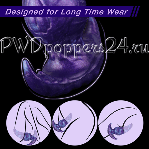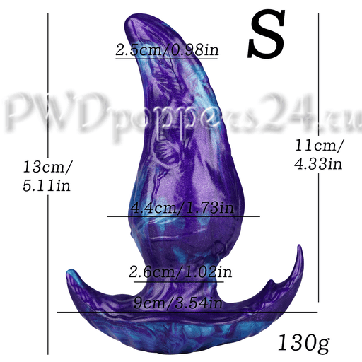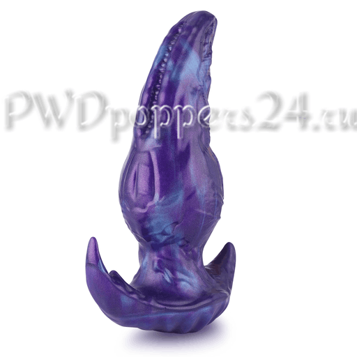 На первый взгляд бросается необычная палитра — глубокий пурпур с прожилками прозрачного синего, создающими эффект живого, пульсирующего тела. Визуально поверхность напоминает морщинистую плоть инопланетного тентакля, где по бокам тянутся чёткие жилки (vivid veins), а корпус украшен как цепочечной, так и листовидной микротекстурой (chain-textured groove и leaf-patterned groove). Наконечник аккуратно сужается, а затем переходит в плавный изгиб-хвост, который добавляет изделию кинематографичной динамики и позволяет чувствовать каждую деталь при соприкосновении.